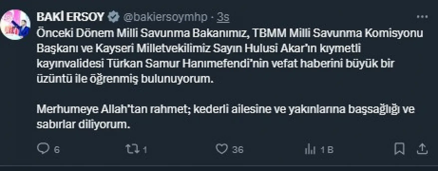 MHP Kayseri Milletvekili Baki Ersoy, Önceki Dönem Milli Savunma Bakanı, TBMM Milli Savunma Komisyonu Başkanı ve Kayseri Milletvekilimiz Sayın Hulusi Akar’a taziye mesajı yayımladı.