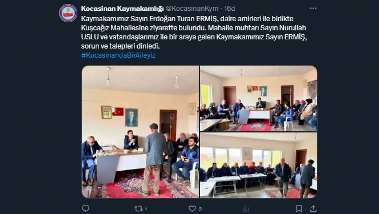 Kaymakam Erdoğan Turan ERMİŞ, daire amirleri ile birlikte Kuşcağız Mahallesine ziyarette bulundu. Mahalle muhtarı Sayın Nurullah USLU ve vatandaşlarımız ile bir araya gelen Ermiş, sorun ve talepleri dinledi.