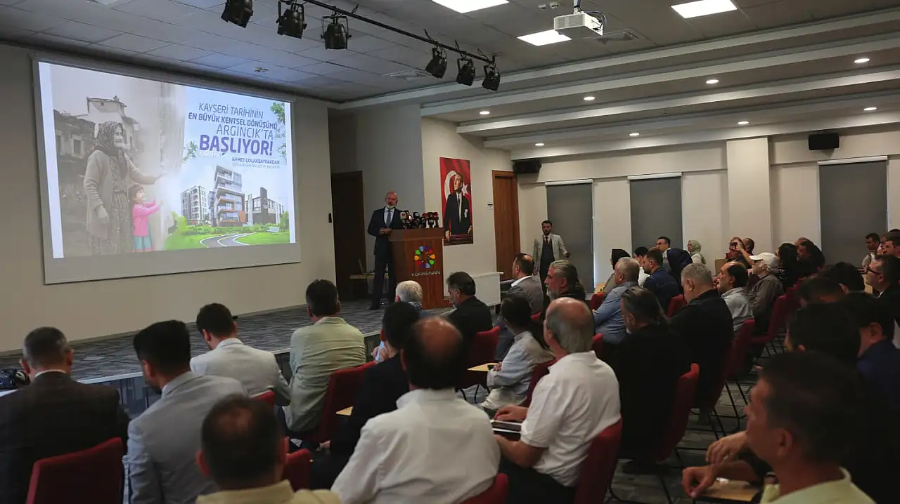 Kocasinan Belediye Başkanı Ahmet Çolakbayrakdar, Kayseri’nin geleceğini şekillendirecek Argıncık Kentsel Dönüşüm Projesi hakkında Erkilet Hacı Mustafa Tarman Kültür Merkezi’nde basın mensuplarına açıklamalarda bulundu.