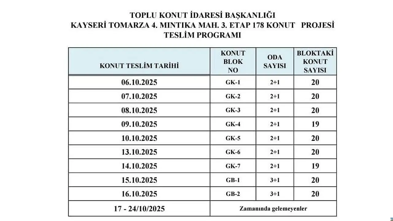 Gönderilen bilgilere göre teslimler 6 Ekim’de başlayacak, 16 Ekim’de sona erecek. Bu süreçte hak sahipleri, kendilerine bildirilen gün ve saatlerde TOKİ yetkililerine başvurarak evlerinin anahtarlarını alabilecek.