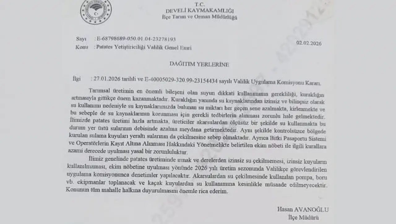 Resmi yazıda özellikle patates üretimindeki hızlı artışa dikkat çekiliyor. Ölçüsüz sulamanın akarsuların debisini düşürdüğü, kontrolsüz kuyuların ise yeraltı su rezervlerini zorladığı ifade ediliyor. Bu nedenle denetimlerin önümüzdeki üretim sezonunda yoğunlaşacağı bildiriliyor.