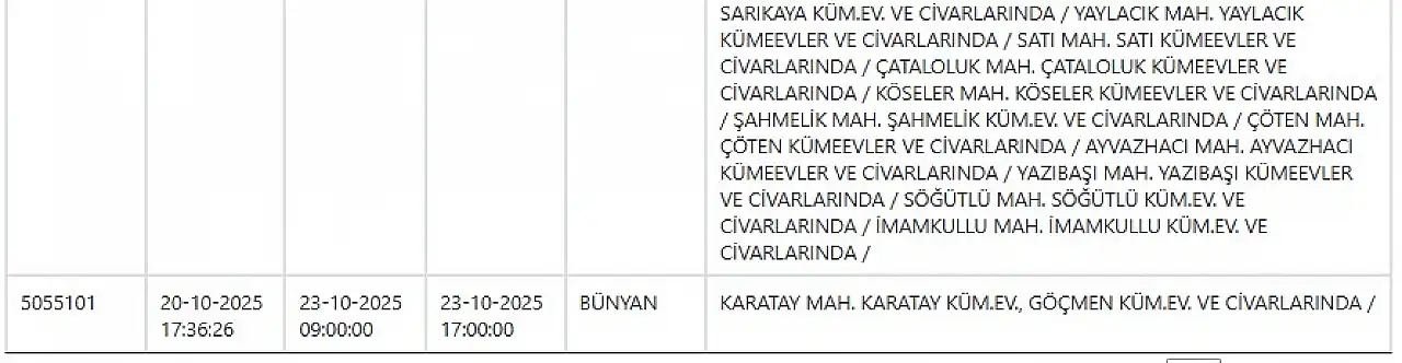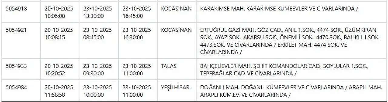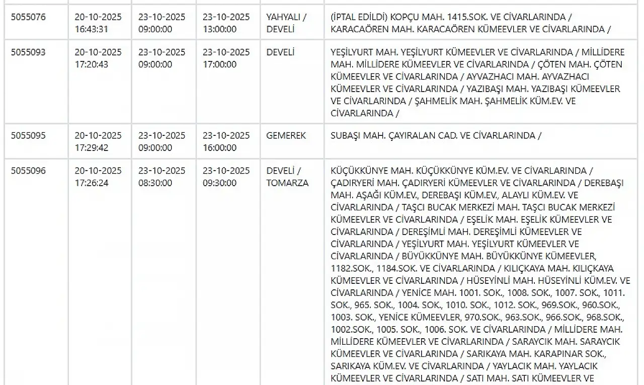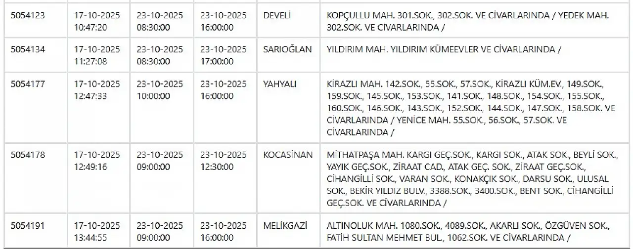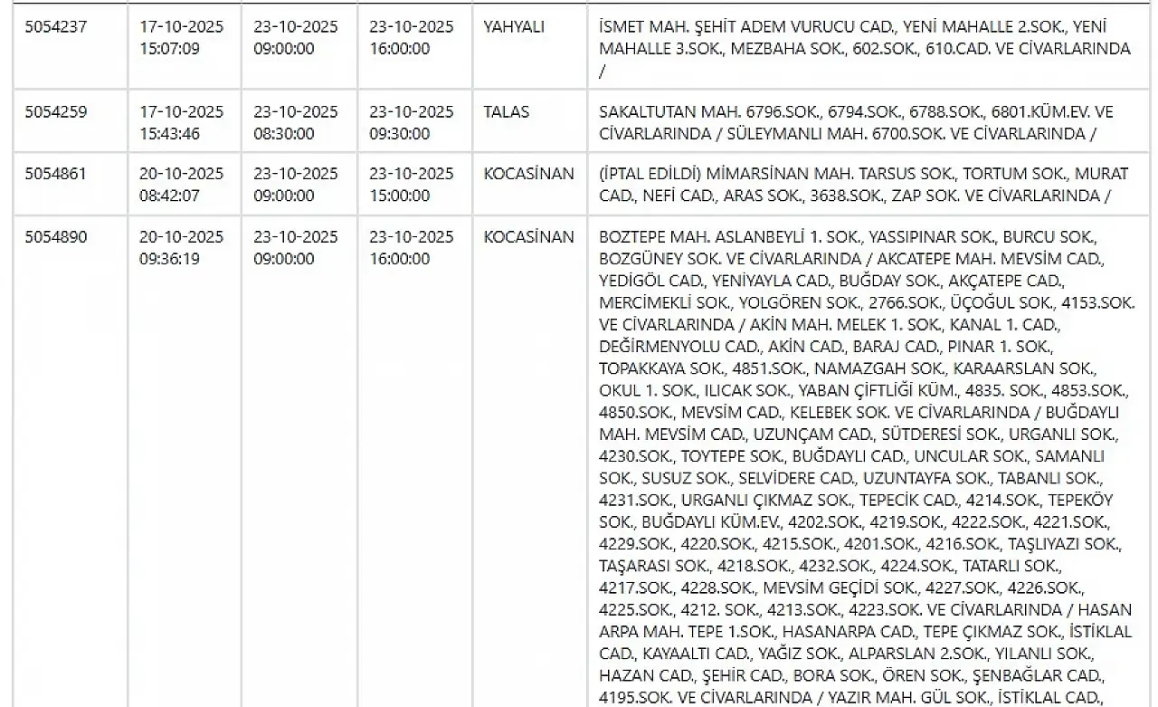 KCETAŞ’tan edinilen bilgilere göre yarın (23 Ekim 2025) aşağıdaki mahallelerde elektrik kesintisi yaşanacak.