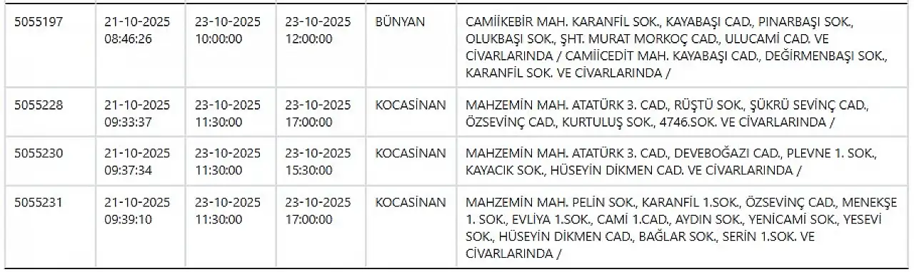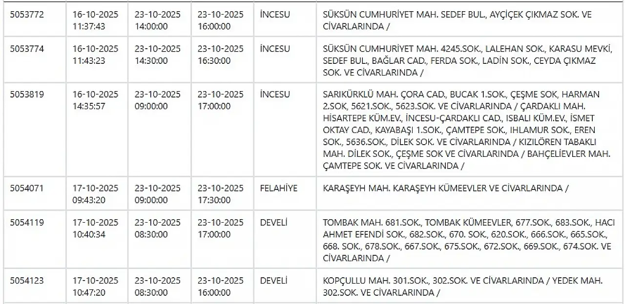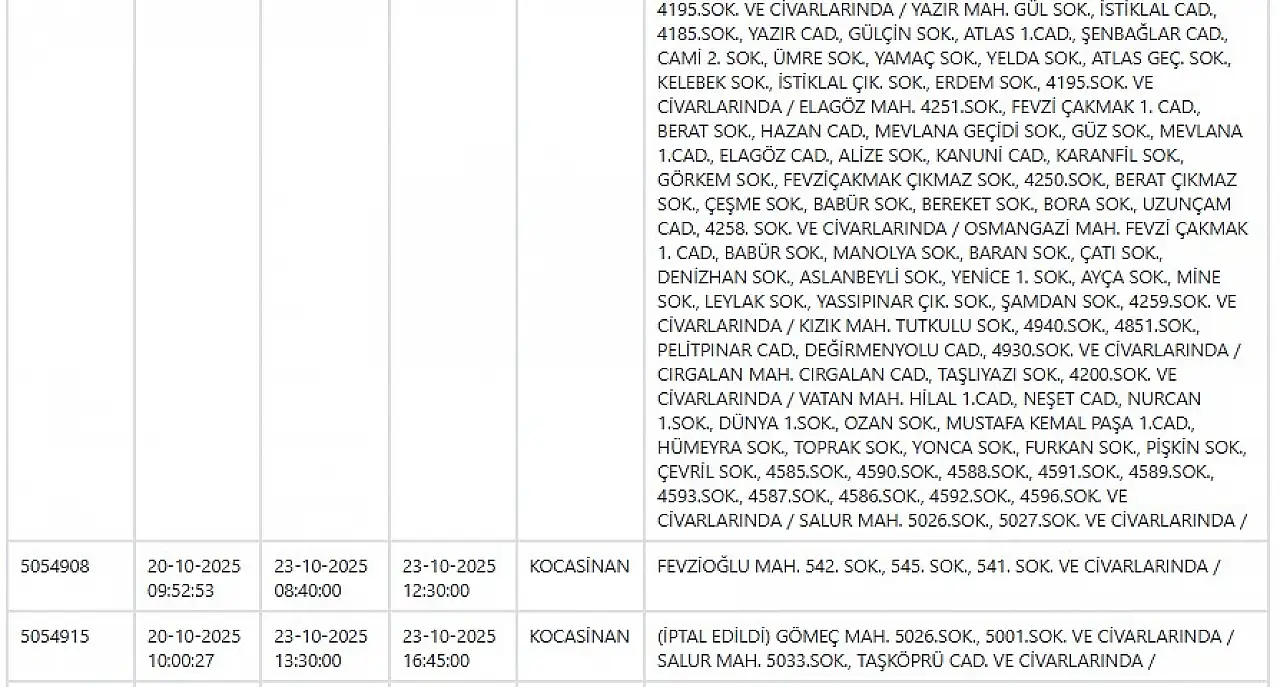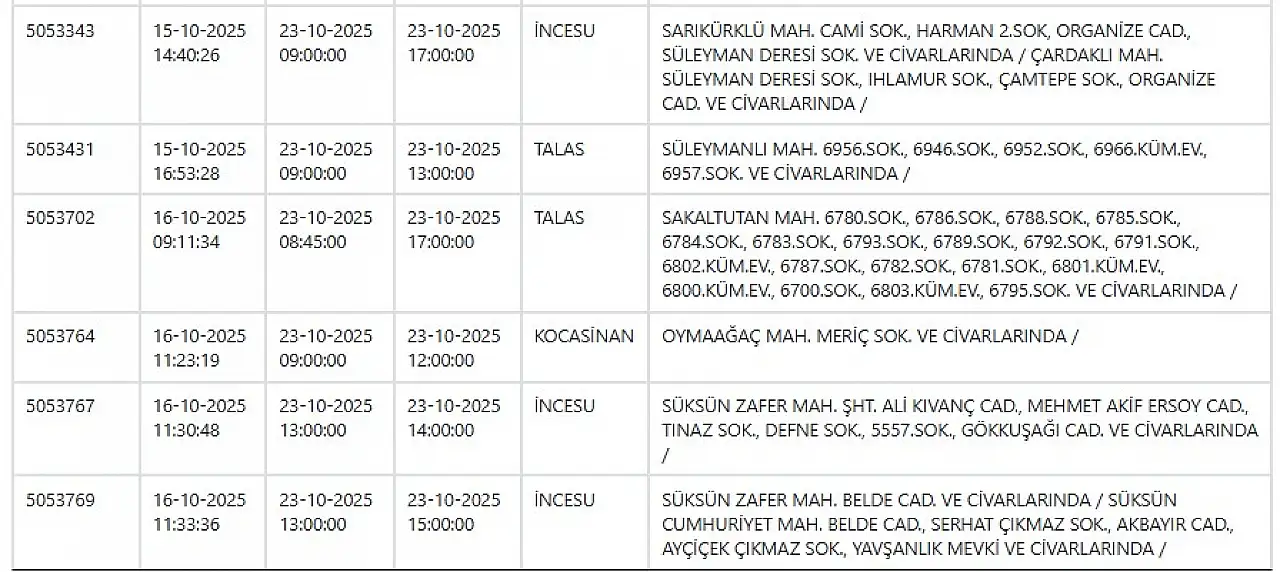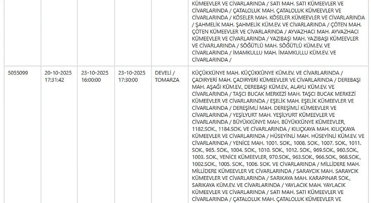 KCETAŞ’tan edinilen bilgilere göre yarın (23 Ekim 2025) aşağıdaki mahallelerde elektrik kesintisi yaşanacak.