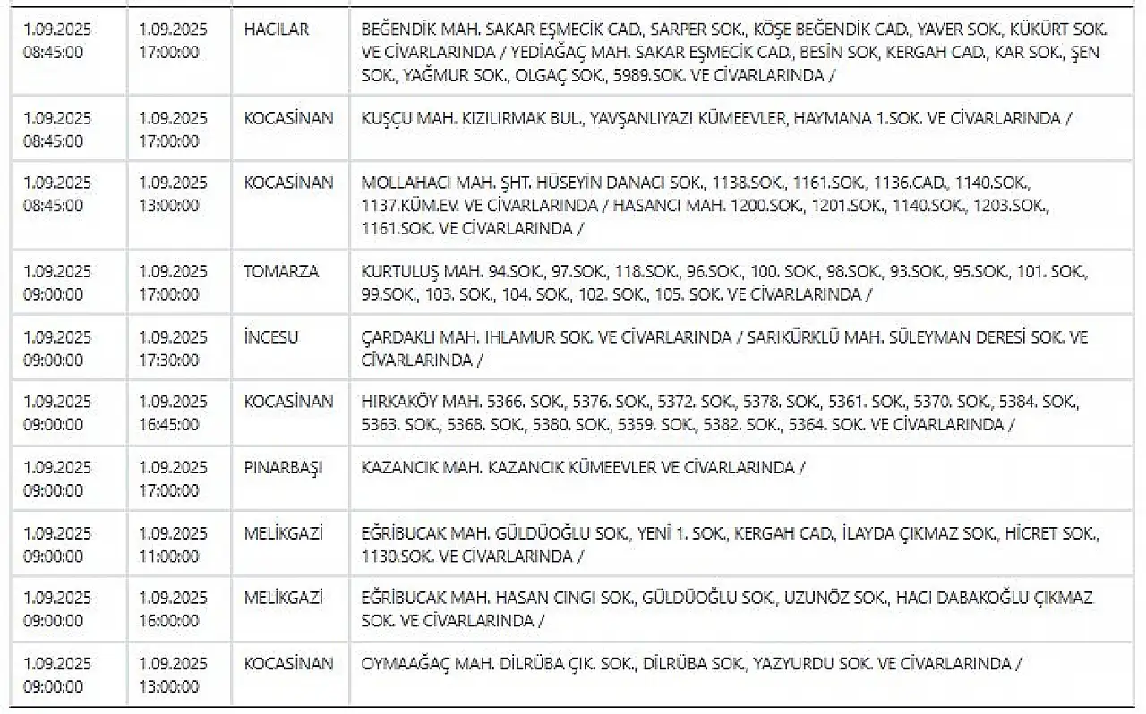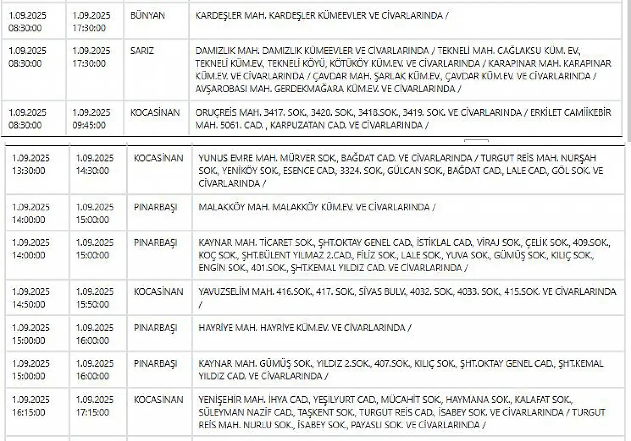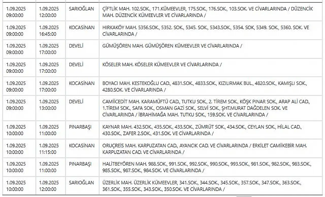 - Kayseri'ye haftanın ilk günü elektrik kesintisi uyarısı yapıldı! Hazırlıklı olun… 1 Eylül 2025