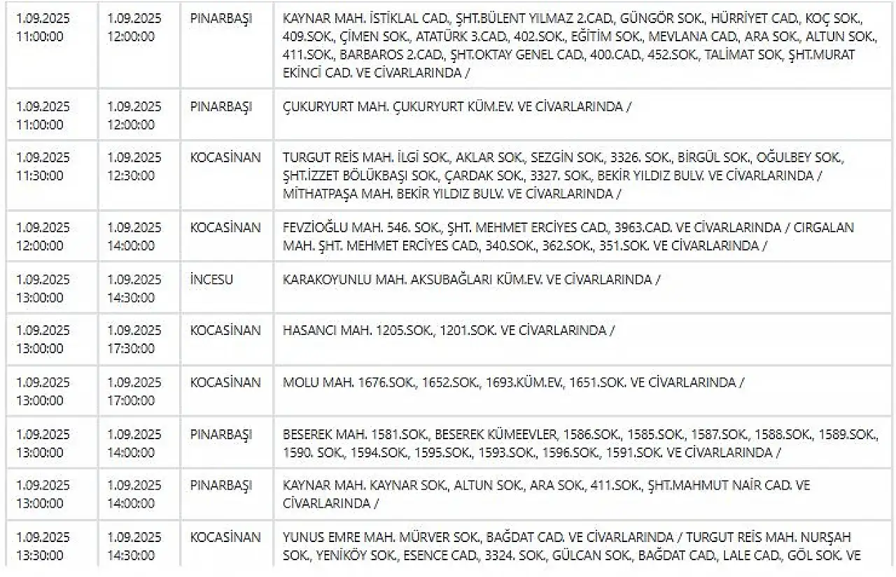 KCETAŞ’tan edinilen bilgilere göre yarın (1 Eylül 2025) aşağıdaki mahallelerde elektrik kesintisi yaşanacak.