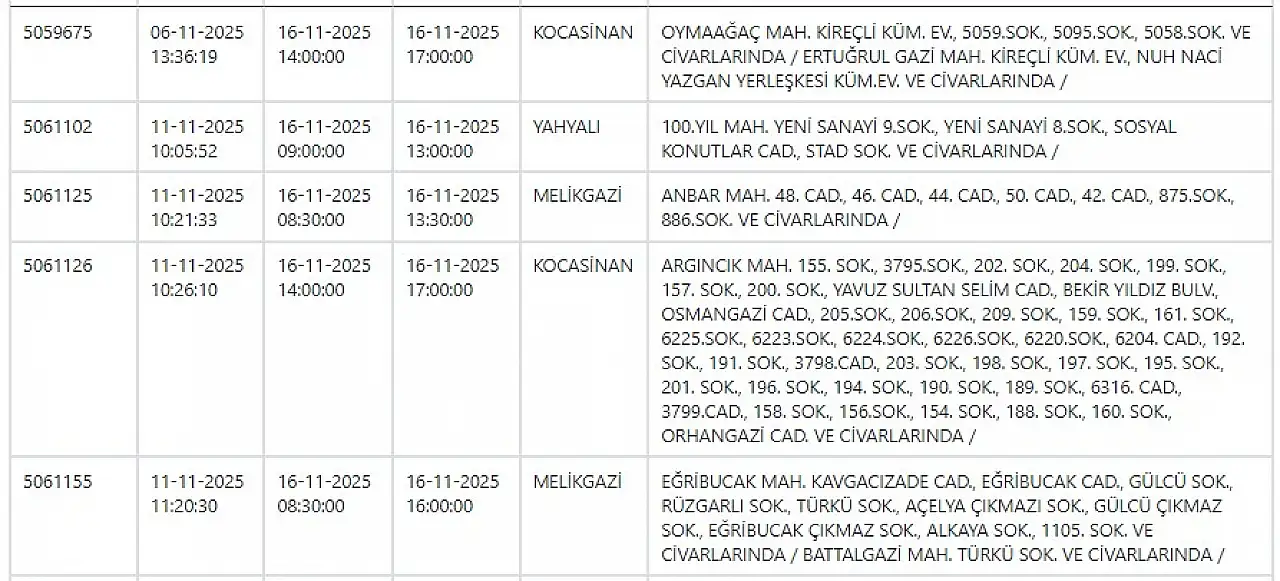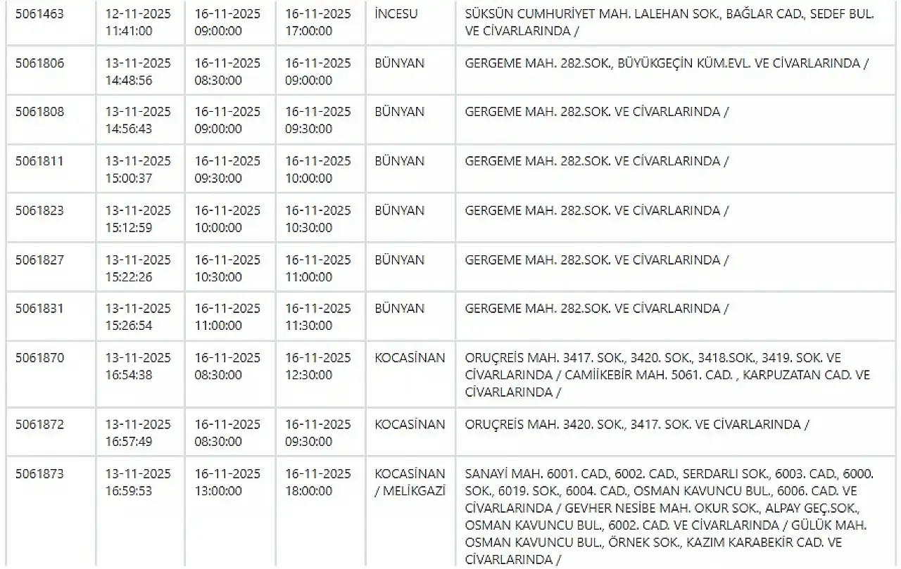 - Kayseri'ye KCETAŞ'tan hafta sonu uyarısı: İşte 16 Kasım elektrik kesintisi listesi...