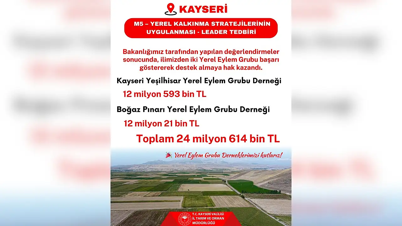 İl Müdürlüğü tarafından yapılan açıklamaya göre: ‘’M5 – Yerel Kalkınma Stratejilerinin Uygulanması – LEADER Tedbiri'' kapsamında yapılan değerlendirmeler sonucunda Kayseri'de İki Yerel Eylem Grubu başarı gösterdi.