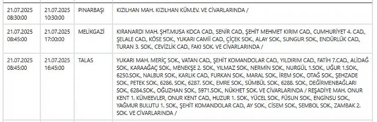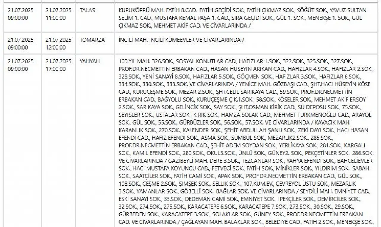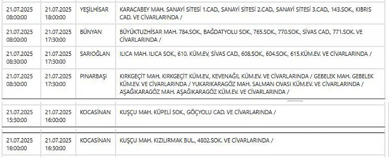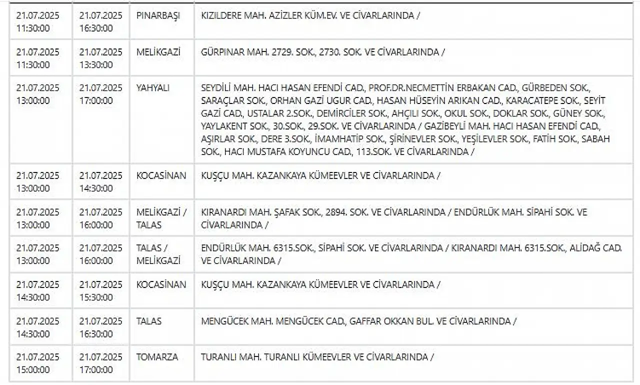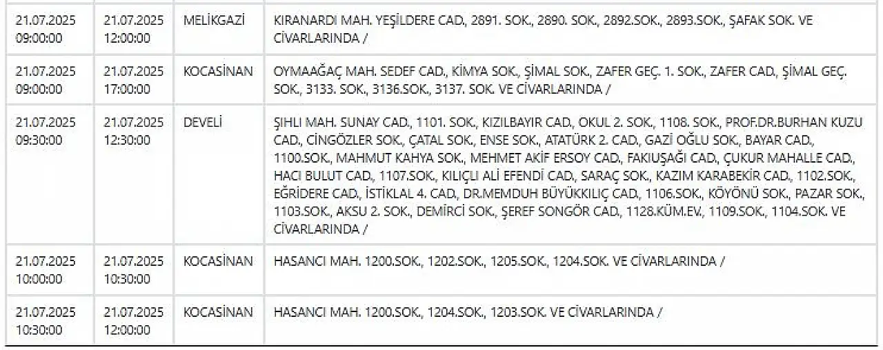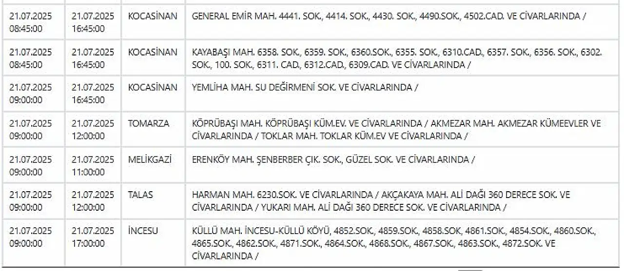 KCETAŞ’tan edinilen bilgilere göre yarın (21 Temmuz 2025) aşağıdaki mahallelerde elektrik kesintisi yaşanacak.