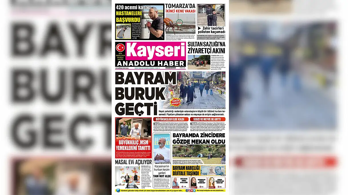 Kayseri Anadolu Haber Gazetesi bugün manşetine bayram sürecinde yaşanan ekonomik zorlukları taşıdı. Kurban Bayramı'nda kurbanlık satışlarının düşüş gösterdiği ve piyasalardaki yüksek fiyatlı seyrin vatandaşlar için zorlayıcı olduğunu belirtti. Gazete ‘’Bayram Buruk Geçti'' manşetiyle okuyucularının karşısına çıktı.