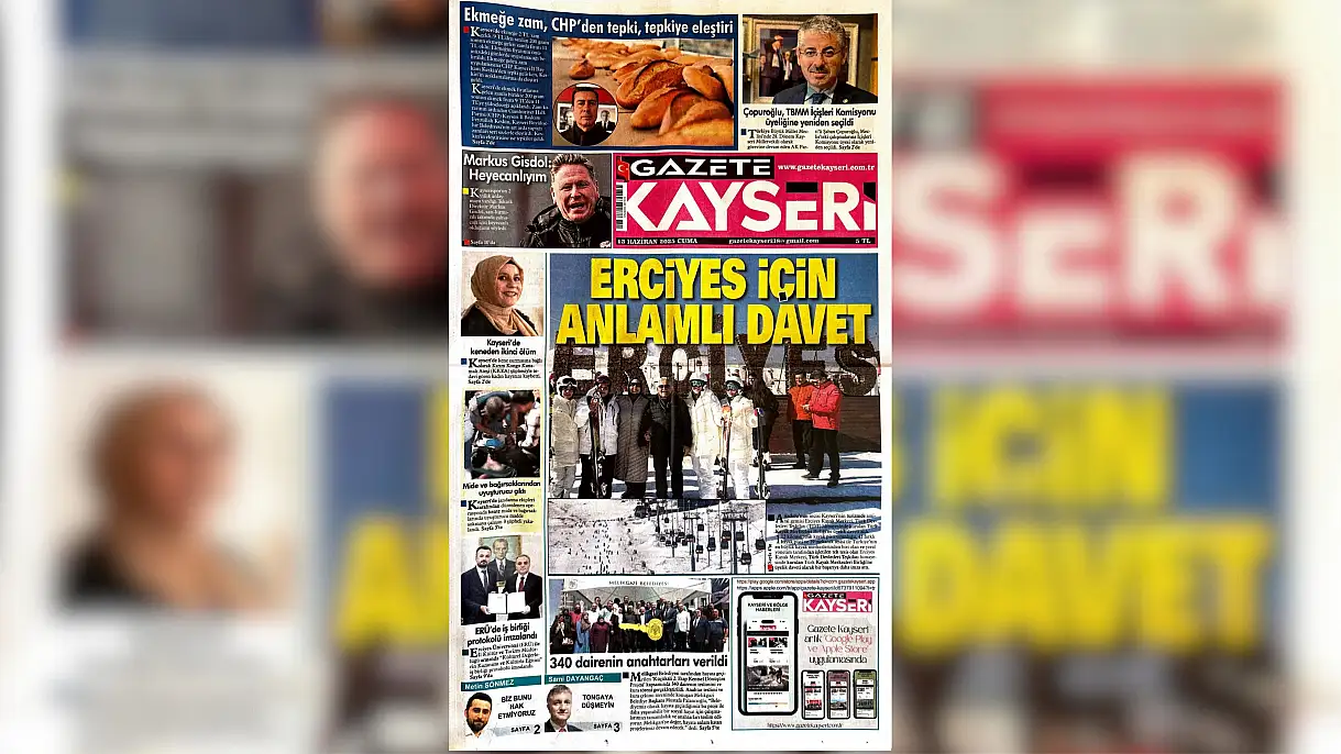 Gazete Kayseri bugün manşetine Erciyes Kayak Merkezi'ne yönelik olarak Türk Devletleri Teşkilatı bünyesinde kurulan Türk Kayak Merkezleri Birliği'nden gelen üyelik davetine yer verdi. Melikgazi Belediyesi'nin anahtar teslim töreni de ilk sayfada yer aldı.