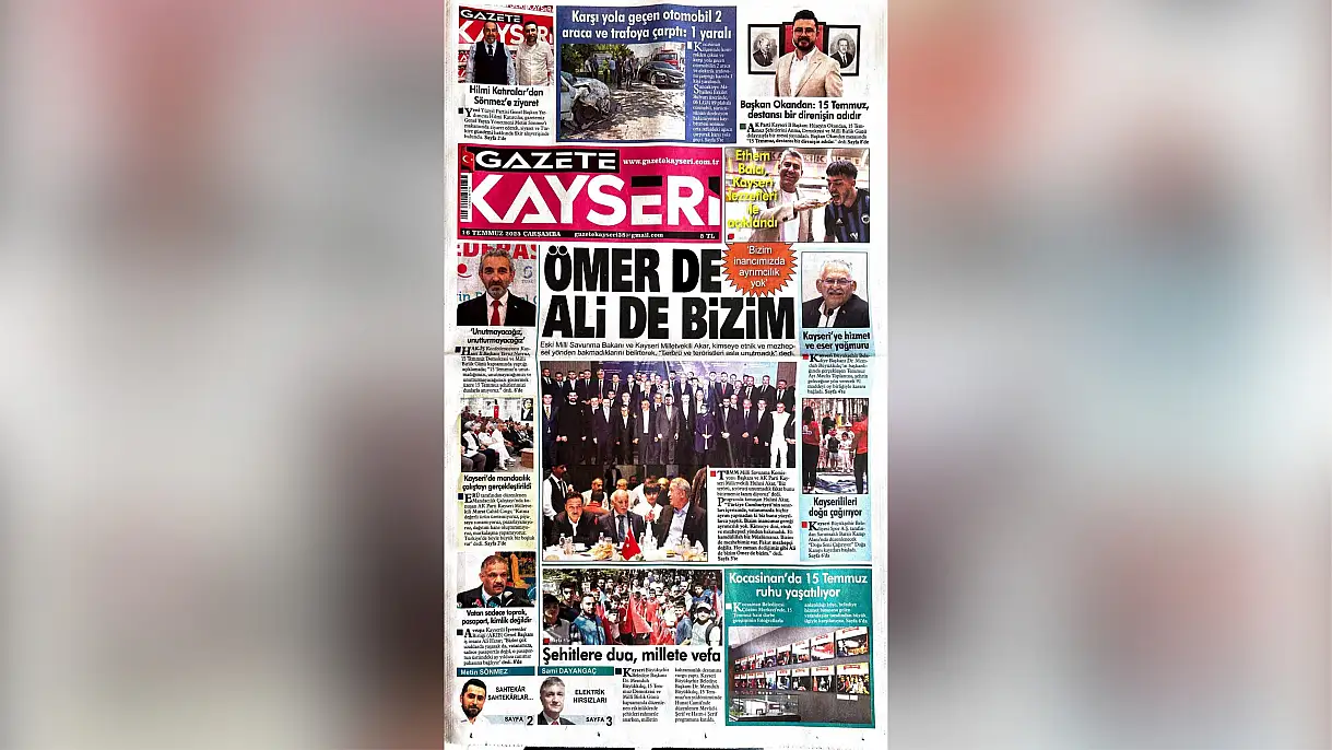 Gazete Kayseri bugün manşetine TBMM Milli Savunma Komisyonu Başkanı ve AK Parti Kayseri Milletvekili Hulusi Akar'ın açıklamalarına yer verdi. Gazetenin ilk sayfasında Kayseri'de düzenlenen 15 Temmuz etkinliklerine de geniş yer verildi.