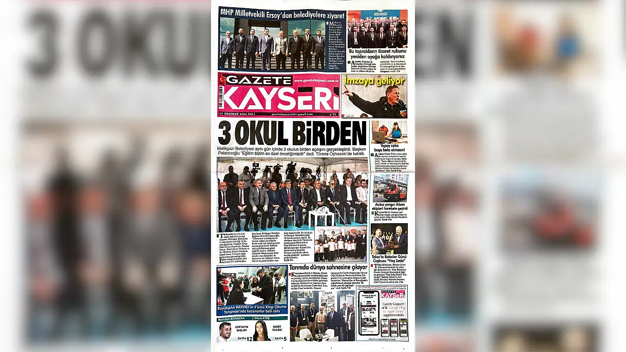 Gazete Kayseri bugün manşet haberinde ‘’3 Okul Birden'' ifadeleriyle Melikgazi ilçesinde Av. Mehmet Altun'un hayırseverliği ile açılışı gerçekleştirilen 3 okula yer verdi. Törene önceki dönem Çevre Şehircilik ve İklim Değişikliği Bakanı Özhaseki'nin de katıldığı belirtildi.