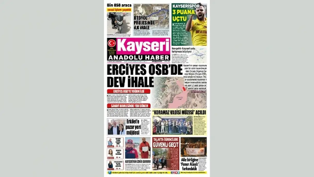 Kayseri Anadolu Haber bugün manşetine Erciyes Organize Sanayi Bölgesi'nde yürütülen ihale süreci haberi ile çıktı. 'Erciyes OSB'de Dev İhale' manşeti ile verilen haberde Erciyes OSB'de yeni sürece gösterilen ilgiye değinildi. Çalışmalar hakkında bilgi verildi. Gazetenin ilk sayfasında yeni otoyol ile ilgili açıklamalarda öne çıktı.