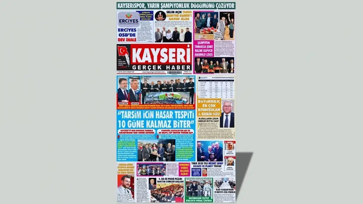 Kayseri Gerçek Haber bugün gazetesinin ilk sayfasında zirai don sonrası kamuoyunda sıklıkla konuşulan hasar tespit çalışmalarını taşıdı. Gazete ‘TARSİM İçin Hasar Tespiti 10 Güne Kalmaz Biter’ haberi ile manşete çıktı. Tarım ve Orman Bakanı İbrahim Yumaklı'nın açıklamalarına yer verdi. Yeni otoyol projesi ve Erciyes OSB İhale süreci de ilk sayfada yer alan haberler arasında yer aldı.