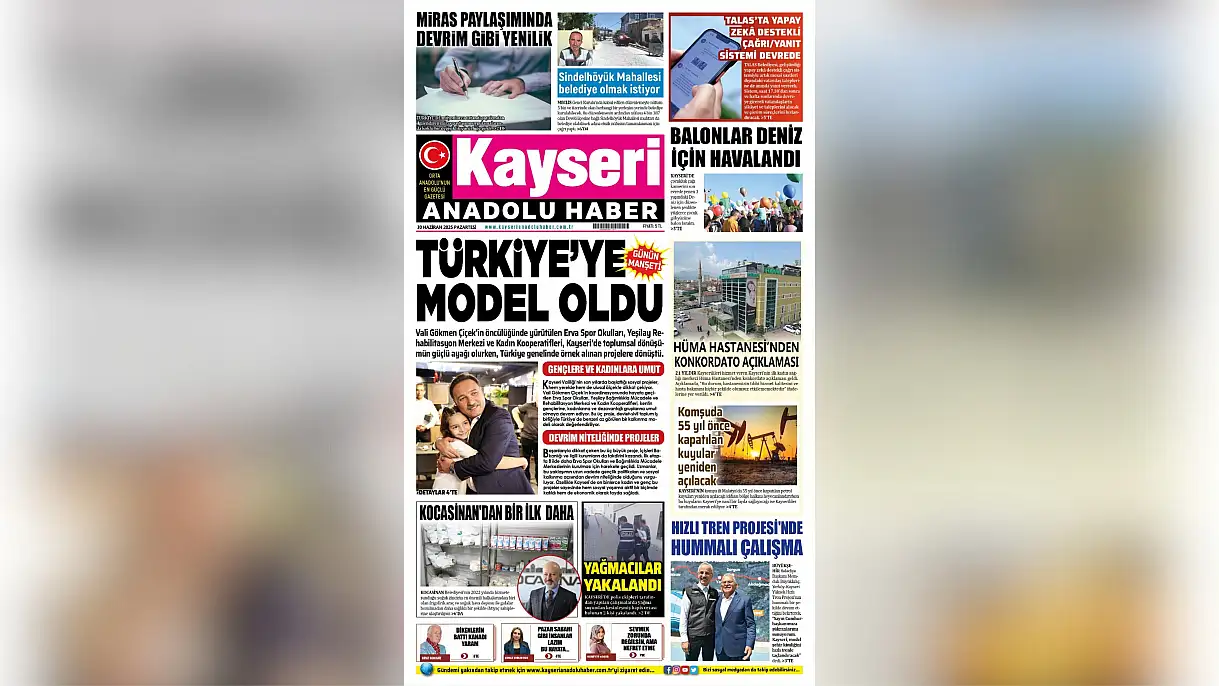 Kayseri Anadolu Haber Gazetesi bugün manşet haberine Kayseri Valiliği ve Kayseri Valisi Gökmen Çiçek'in şehir genelinde yürütülen çalışmalara yer verdi. Manşet haberde yürütülen çalışmaların Türkiye genelinde rol model oluşturulduğuna vurgu yapıldı.