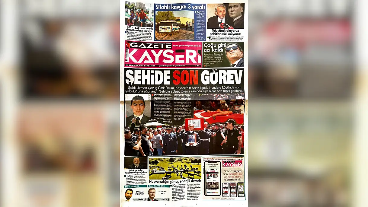 Gazete Kayseri bugün manşetine Kayseri'de son yolcuğunu uğurlanan Şehit Uzman Çavuşu Ümit Üzüm'e yer verdi. 'Şehide son görev'' ifadelerinin yer aldığı haberde törene ilişkin detaylara yer verildi.