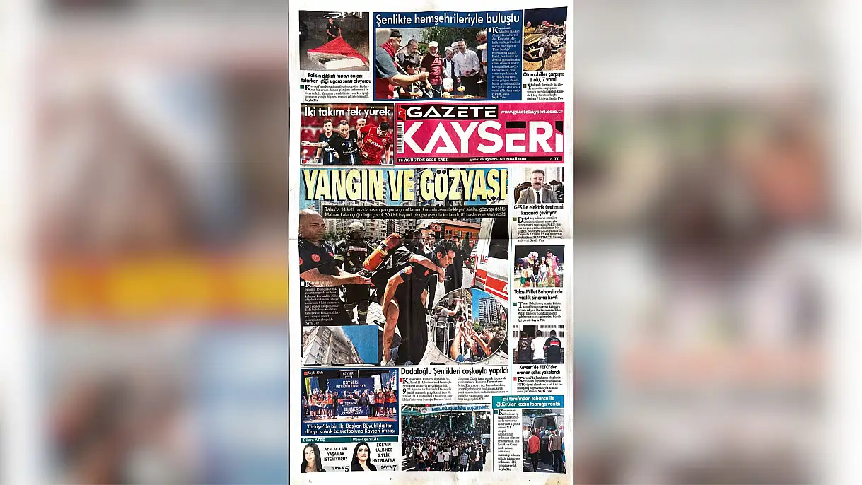 Gazete Kayseri bugün manşetine Talas'ta 14 katlı apartmanın 13'ncü katında çıkan yangına yer verdi. Yangında 30 kişinin kurtarıldığı bilgisi paylaşılırken, itfaiye, polis ve sağlık ekiplerinin çabalarına dikkat çekildi.