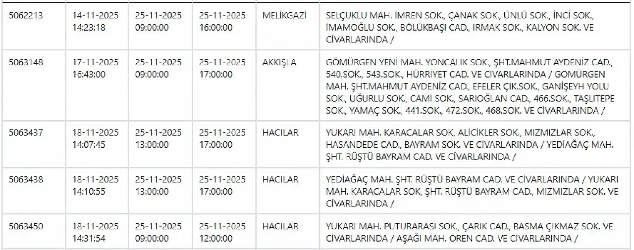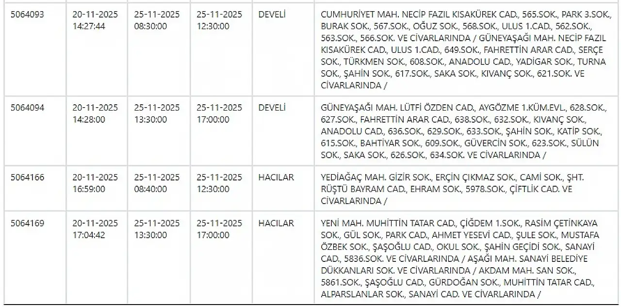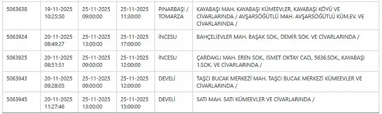 KCETAŞ’tan edinilen bilgilere göre yarın (25 Kasım 2025) aşağıdaki ilçe ve mahallelerde elektrik kesintisi yaşanacak.