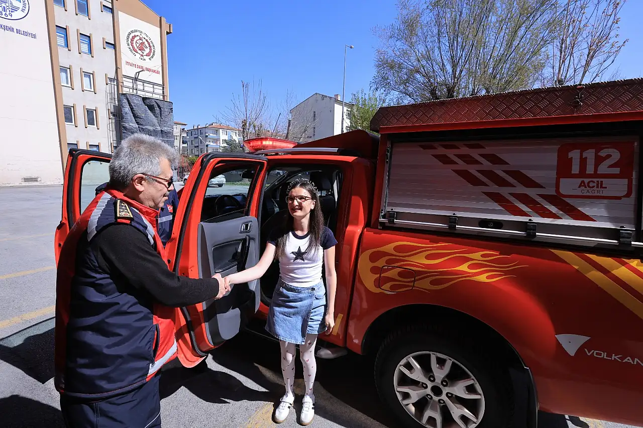 İtfaiye aracına binmenin kendisi için en büyük mutluluklardan biri olduğunu ifade ettiği anlarda, ‘Bugün için kutlamalar bekliyordum, çok mutluyum’ diyen Aleyna, büyük bir heyecanla araçta yerini aldı.