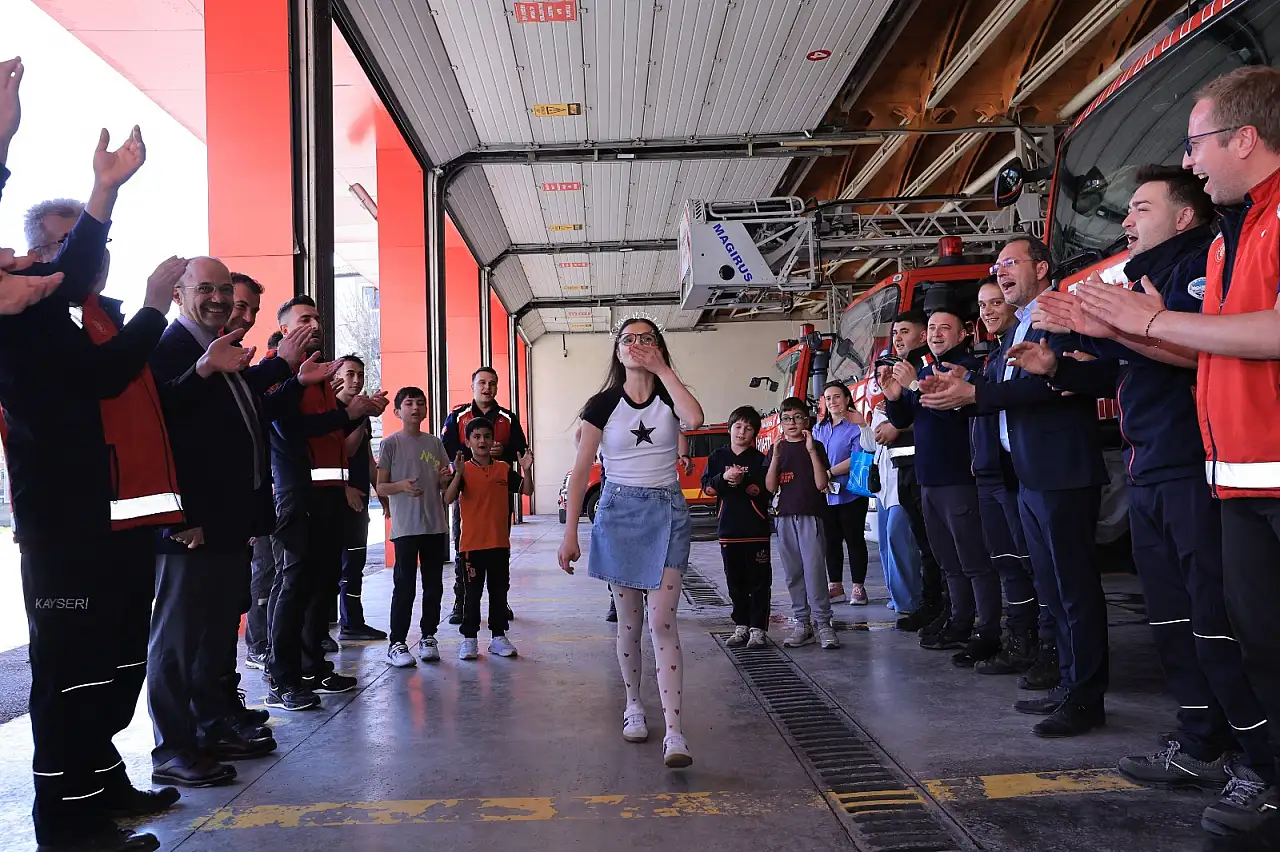 Kayseri İtfaiye Teşkilatı tarafından, coşkuyla karşılanan Aleyna’nın mutluluğu gözlerinden okundu. İtfaiye teşkilatının sloganları ve alkışları arasında, itfaiye alanına ulaşan Aleyna, kendisini karşılayan İtfaiye Daire Başkanı Mustafa Metin Kızılkan’a teşekkürlerini iletti.