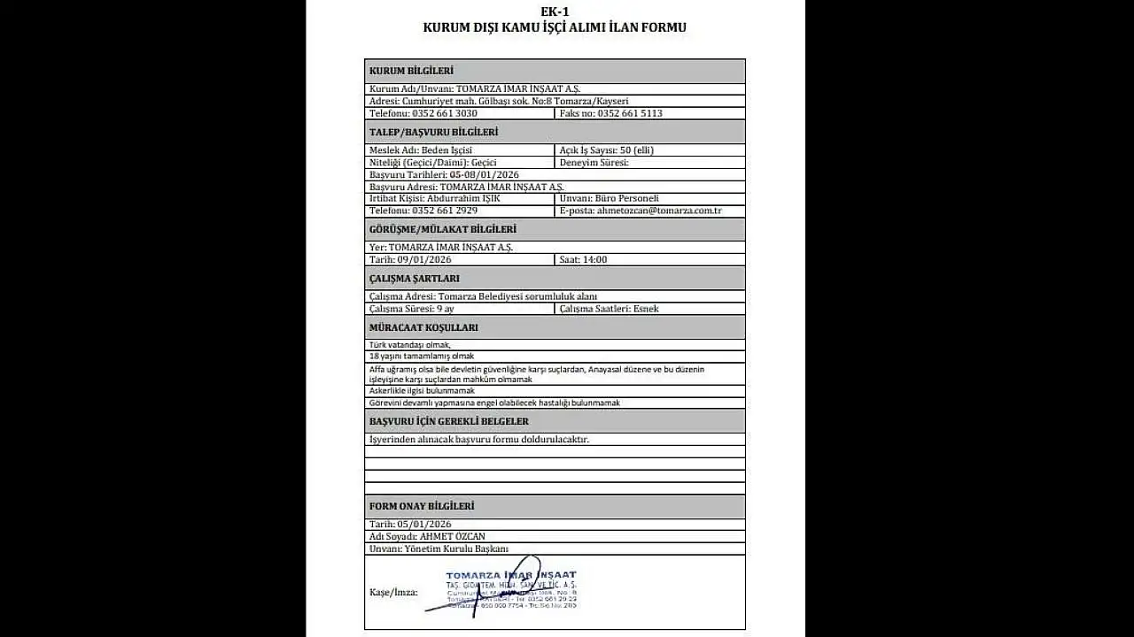 Yayımlanan ilana göre personeller, belediyenin sorumluluk alanlarında yürütülen saha çalışmalarında görev alacak. Alımın geçici süreli olacağı, başvuruların ardından yapılacak değerlendirme süreciyle birlikte personel seçiminin tamamlanacağı açıklandı. Söz konusu alım, Tomarza Belediyesi’ne bağlı Tomarza İmar İnşaat A.Ş. üzerinden yürütülecek.