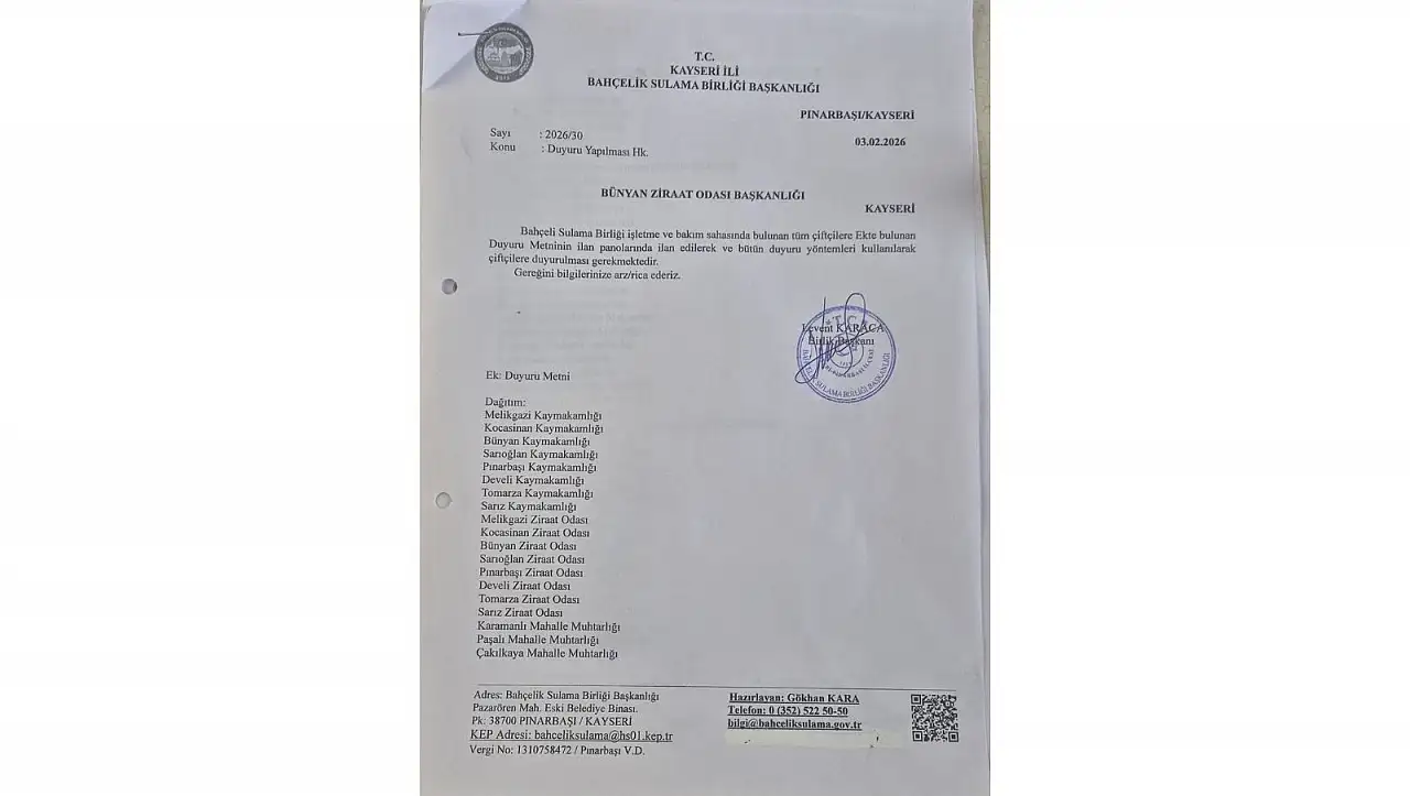 Bahçelik Sulama Birliği işletme ve bakım sahasında bulunan tüm çiftçilere söz konusu duyuru çiftçilere ilan edildi. Melikgazi Kaymakamlığı, Kocasinan Kaymakamlığı, Bünyan Kaymakamlığı, Sarıoğlan Kaymakamlığı, Pınarbaşı Kaymakamlığı, Develi Kaymakamlığı, Tomarza Kaymakamlığı, Sarız Kaymakamlığı ve ilçe ziraat odalarına ile Karamanlı Mahalle Muhtarlığı, Paşalı Mahalle Muhtarlığı, Çalkıkaya Mahalle Muhtarlığı’na resmi yazı gönderildi.