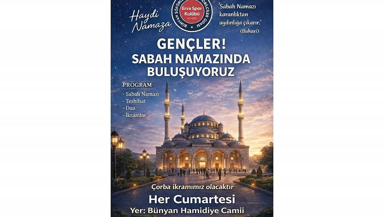 Kayseri’de Bünyan Şoförler ve Otomobilciler Odası tarafından düzenlenecek programda gençler sabah namazında buluşacak. Programda namazın ardından ikramlıklar dağıtılacak.