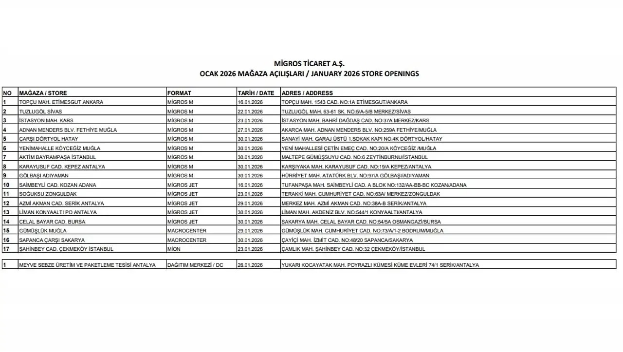 KAP’a yapılan açıklamada, ‘’ Şirketimiz, ekli listede belirtilen 9 adet Migros, 5 adet Migros Jet, 2 adet Macrocenter ve 1 adet Mion olmak üzere toplam 17 yeni mağaza ile 1 adet dağıtım merkezini Ocak ayı içerisinde ekte belirtilen tarihlerde hizmete açmıştır. 31 Ocak 2026 itibarıyla Şirketimizin toplam mağaza sayısı 3.804'e ulaşmıştır.’’ ifadeleri yer aldı.