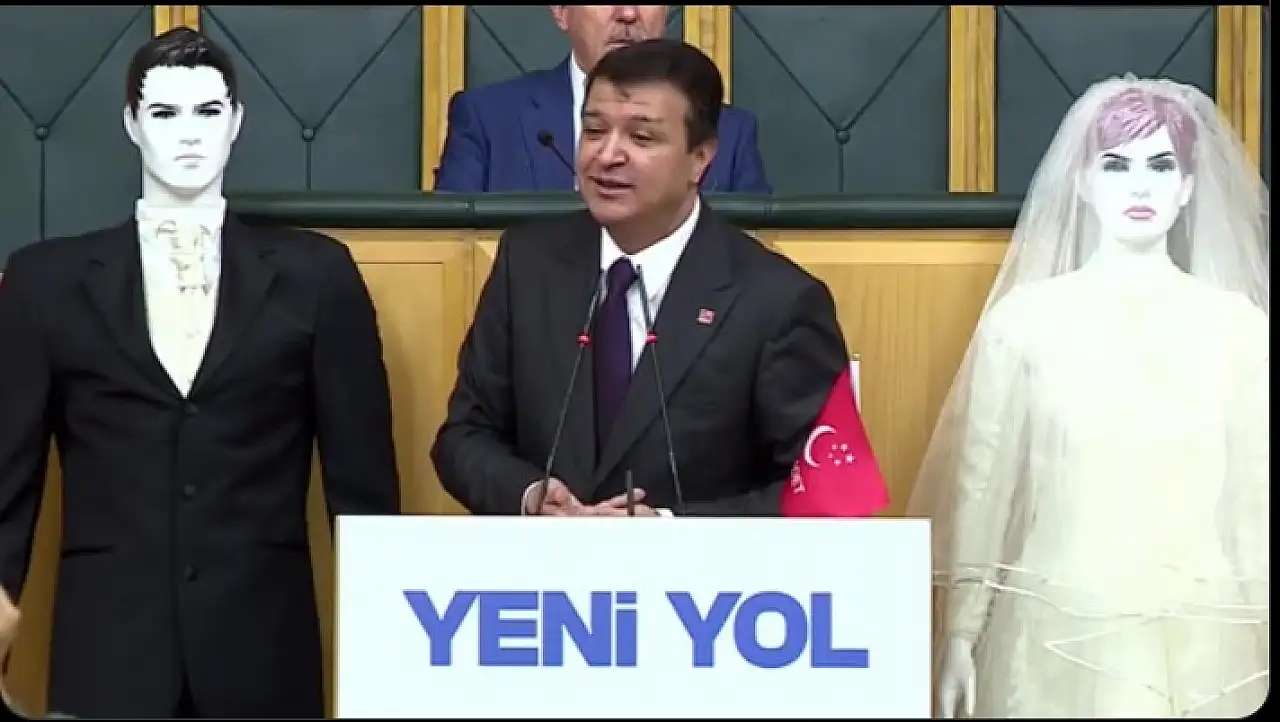 Saadet Partisi Genel Başkanı Mahmut Arıkan, TBMM'de kürsüye gelinlik ve damatlık giydirilmiş cansız mankenlerle çıktı. Arıkan, gençlerin evlenmekte yaşadığı ekonomik zorlukları gözler önüne sererek hükümetin 'Aile Yılı' politikalarına tepki gösterdi.
