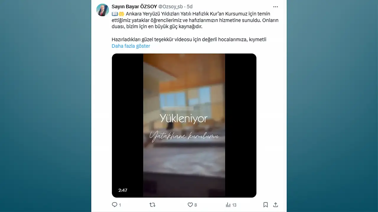 Sosyal medya hesabı üzerinden hazırlanan duygu yüklü videoyu paylaşan Vekil Özsoy, ‘’ Ankara Yeryüzü Yıldızları Yatılı Hafızlık Kur’an Kursumuz için temin ettiğimiz yataklar öğrencilerimiz ve hafızlarımızın hizmetine sunuldu. Onların duası, bizim için en büyük güç kaynağıdır. Hazırladıkları güzel teşekkür videosu için değerli hocalarımıza, kıymetli talebelerimize ve hafızlarımıza gönülden selam ediyor, başarı ve gayretlerinin daim olmasını diliyorum. Rabbim, bu kutlu yolda yürüyen tüm evlatlarımızın ilmini artırsın, hafızlıklarını kolay eylesin. Rabbim, bu kutlu yolda yürüyen tüm evlatlarımızın ilmini artırsın, hafızlıklarını kolay eylesin.’’ ifadelerini kullandı.