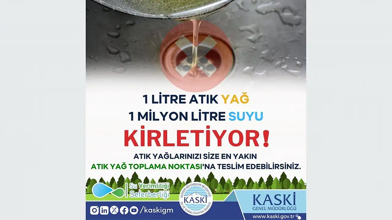 Kayseri Su ve Kanalizasyon İdaresi Genel Müdürlüğü sosyal medya hesabı üzerinden yaptığı paylaşımda. Atık yağların nasıl bertaraf edilmesi gerektiği ve çevreye verdiği zararlar hakkında bilgi verdi. Yapılan bilgilendirici paylaşımda atık yağların tehlikesine dikkat çekildi.