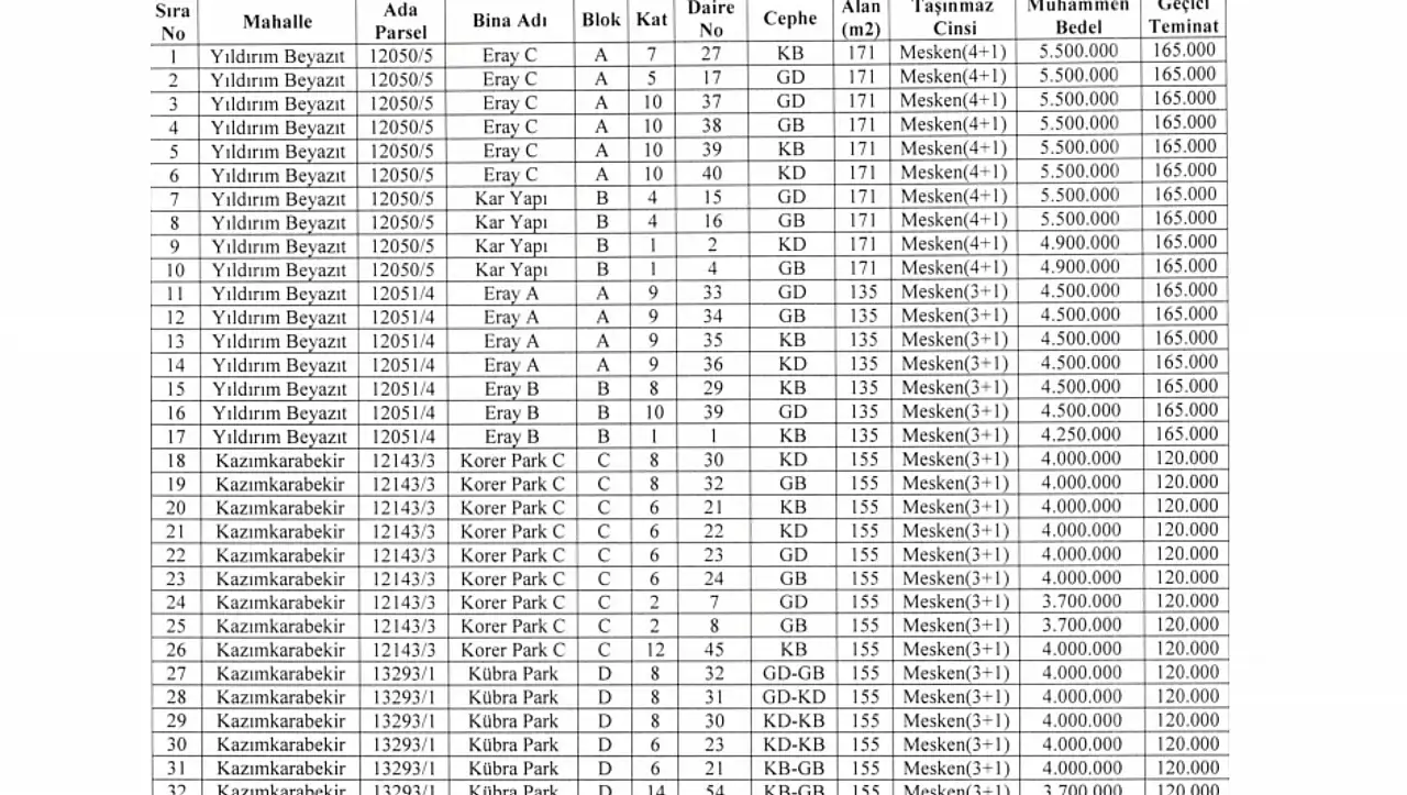 Kayseri’nin Yıldırım Beyazıt ve Kazım Karabekir mahallelerinde 32 taşınmaz satışa çıkıyor. Mülkiyeti Melikgazi Belediyesi’ne ait olan taşınmazlar 4+1 ve 3+1 mesken cinsinde satışa çıkıyor. Belediye alıcılara toplam bedelin en az yüzde 25’ini peşin ödemek şartı ile 36 aya kadar vade farksız taksit imkanı sunarken, peşin ödemelerde yüzde 10 indirim uyguluyor.