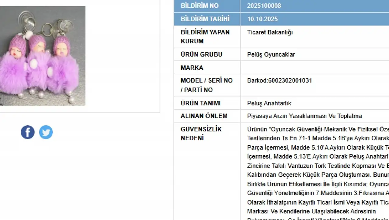 Ağrı Doğubeyazıt merkezli firmaya ait Pelüş Anahtarlık alınan karar kapsamda toplatılıyor. Boğulma riski taşıdığı belirtilen ürüne ilişkin güvensizlik nedeni, oyuncak güvenliği-mekanik ve fiziksel özellikler testlerinden kalmış olması şeklinde açıklandı.
