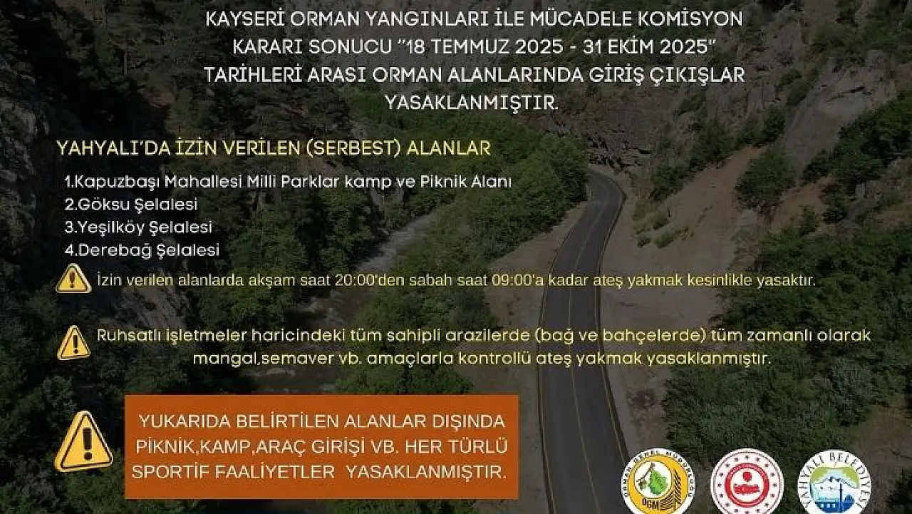 Kayseri Orman Yangınları ile Mücadele Komisyonu’nun aldığı karar doğrultusunda, 18 Temmuz 2025 ile 31 Ekim 2025 tarihleri arasında Kayseri'nin Yahyalı ilçesinde ormanlık alanlara giriş çıkışlar yasaklandı.