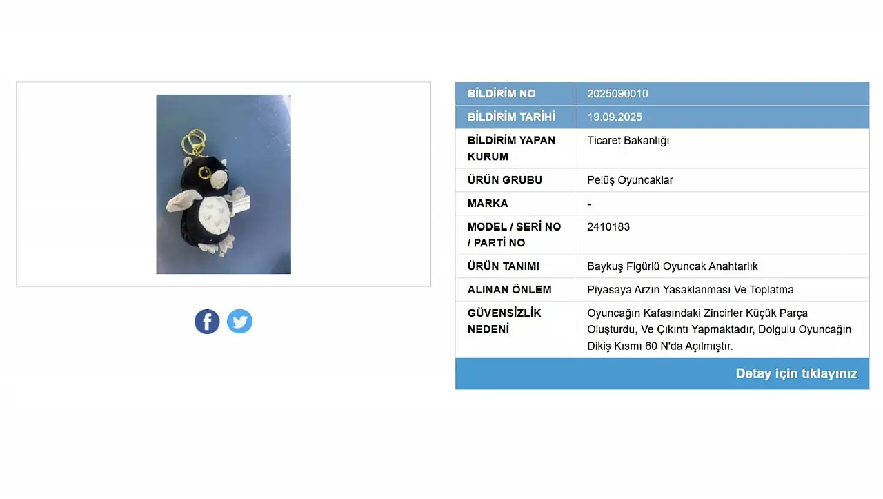 Osman Kızılkaya Varisleri Adi Ortaklığı firmasına ait olan Baykuş figürlü oyuncak anahtarlığın satışı yasaklandı. Ürünün taşıdığı riskler ağız ve burunun dışından solunum yolunun tıkanması ve akciğerlere doğru olan hava akışının mekanik şekilde engellenmesinden kaynaklı boğulma olarak belirtildi. Oyuncağın kafasındaki zincirlerin küçük parça oluşturduğu ve çıkıntı yaptığı güvensizlik nedeni olarak belirtildi. Ürünün piyasaya arzının yasaklanmasına ve geri toplatılmasına karar verildi.