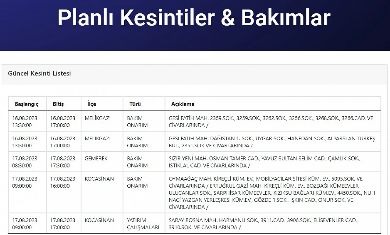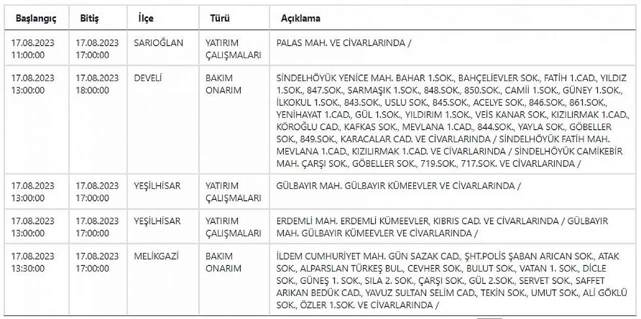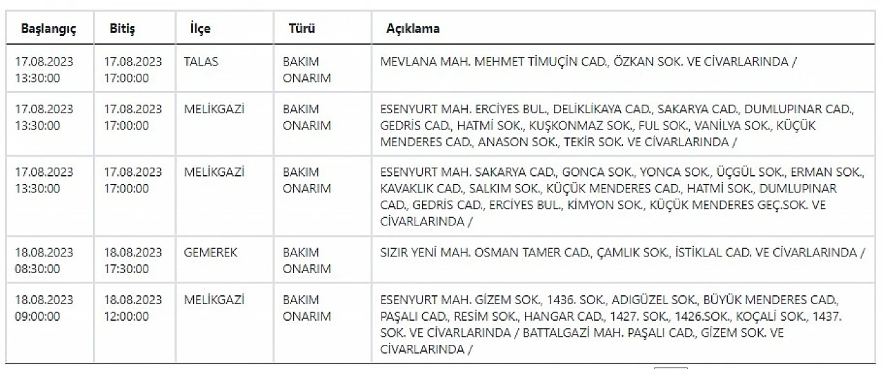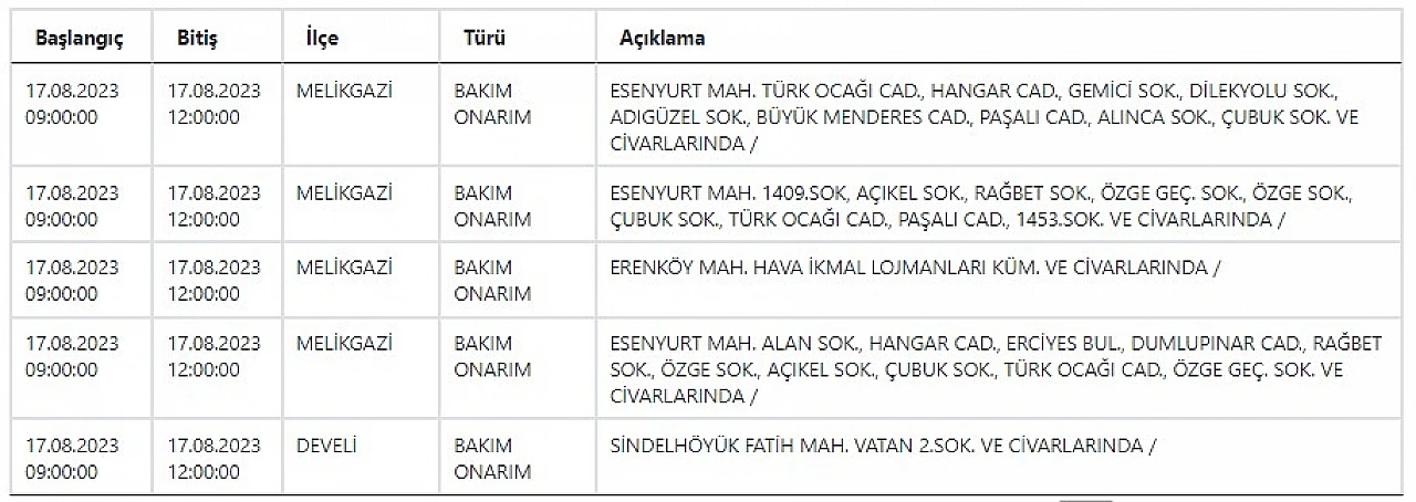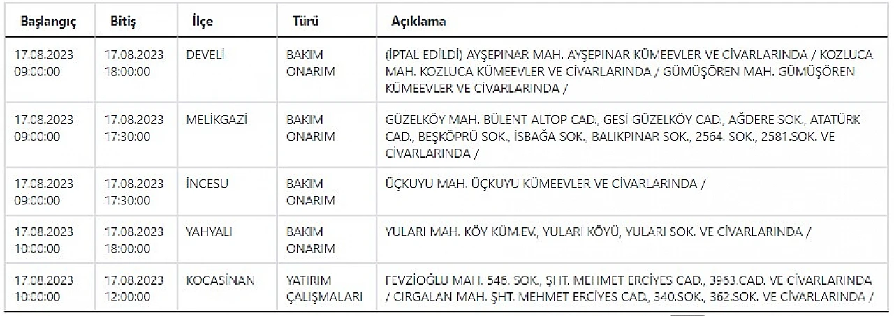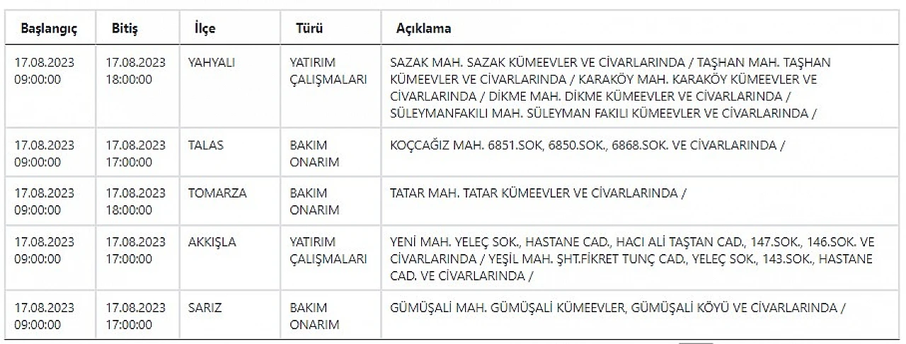 - Kayserililer dikkat, KCETAŞ uyardı! Bugün birçok mahallede elektrik kesilecek… 17 Ağustos 2023
