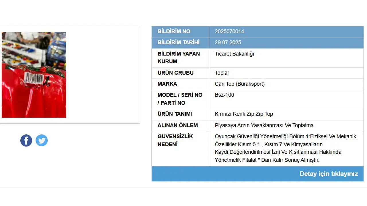 Burak Sport Oyuncak Hırdavat Ve İnş. San.Tic.Ltd.Şti. Can Top (Buraksport) marka Çin menşeli üründe boğulma riski tespit edildi. Bsz-100 seri numaralı ürün için geçerli olan bu kararın güvensizlik nedeni ise kimyasal testinden kalması olarak açıklandı. Ürün kimyasal ve boğuma riski taşıyor.