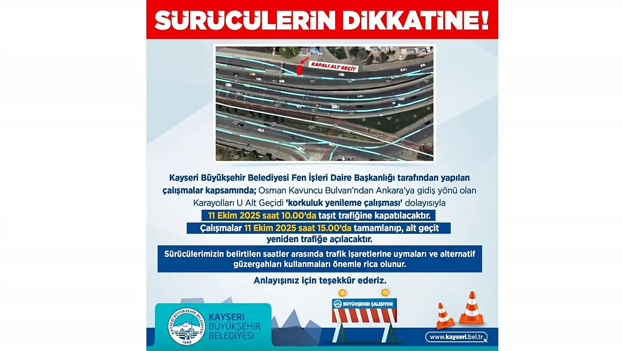 Kayseri Büyükşehir Belediyesi tarafından yapılan açıklamaya göre korkuluk yenileme çalışması saat 10.00 sularında başlayacak. Gün içerisinde tamamlanacak çalışmalar neticesinde yol 11 Ekim Cumartesi günü saat 15.00’da tamamlanarak alt geçit yeniden trafiğe açılacak.