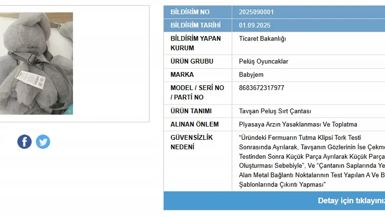 İstanbul merkezli Babyjem Bebek Ürünleri Sanayi Ticaret ve Anonim Şirketi’ne ait Babyjem marka (seri no: 8683672317977) tavşan pelüş sırt çantası pelüş oyuncağın boğulma riski taşıdığı belirtildi. Güvensizlik nedeni fermuarın tutma kısmının dayanıklılık testinde kopması. Çekme testinde tavşanın gözlerinin koparak küçük parçaya dönüşmesi ve çanta saplarının metal kısımlarının güvenlik testinden kalması şeklinde açıklandı.