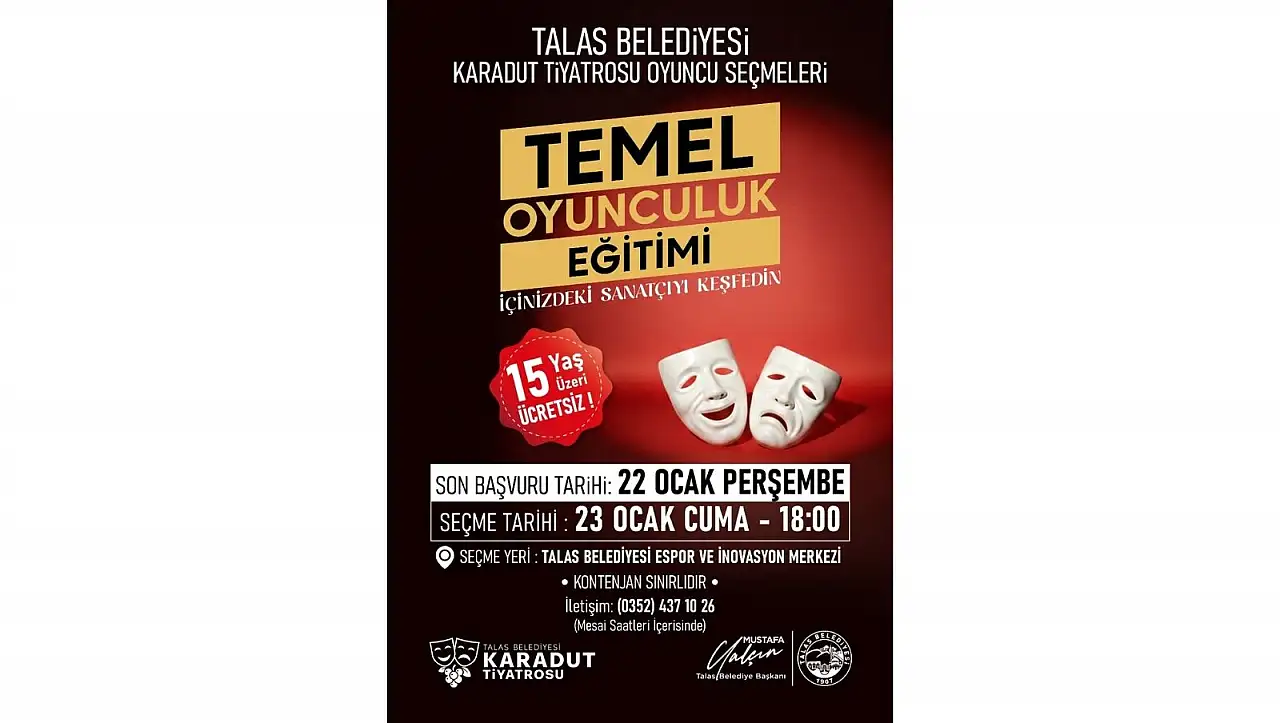 Talas Belediyesi, sanatı ve kültürü şehir yaşamının ayrılmaz bir parçası olarak görmeye devam ediyor. Bu anlayışla Talas Belediyesi bünyesinde faaliyet gösteren Karadut Tiyatrosu, sahneye gönül veren yetenekleri keşfetmek amacıyla Temel Oyunculuk Eğitimi için oyuncu seçmeleri düzenliyor. Kontenjanla sınırlı olacak eğitimler öncesinde yapılacak seçmelerle, Karadut Tiyatrosu çatısı altında yeni yetenekler sahneyle buluşturulacak.