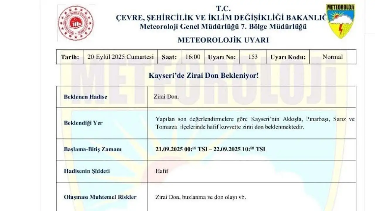 Meteoroloji Genel Müdürlüğü 7. Bölge Müdürlüğü’nün açıklamasına göre, kentte önümüzdeki günlerde hafif kuvvette zirai donun etkili olacağı öngörülüyor. Sarız Belediyesi tarafından yapılan açıklamada; ‘İlçemizde etkili olacağı tahmin edilen hafif zirai don riskine karşı tedbir alınması gerekmektedir’ denildi.