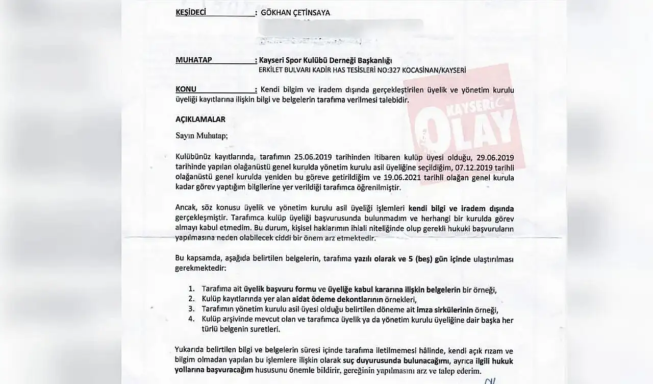 Açıklamanın detayında ise, “Sayın muhatap; Kulübünüz kayıtlarında, tarafımın 25.06.2019 tarihinden itibaren kulüp üyesi olduğu, 29.06.2019 tarihinde yapılan olağanüstü genel kurulda yönetim kurulu asil üyeliğine seçildiğim, 07.12.2019 tarihli olağanüstü genel kurulda yeniden bu göreve getirildiğim ve 19.06.2021 tarihli olağan genel kurula kadar görev yaptığım bilgilerine yer verildiği tarafımca öğrenilmiştir. Ancak, söz konusu üyelik ve yönetim kurulu asil üyeliği işlemleri kendi bilgi ve iradem dışında gerçekleşmiştir. Tarafımca kulüp üyeliği başvurusunda bulunmadım ve herhangi bir kurulda görev almayı kabul etmedim. Bu durum, kişisel haklarımın ihlali niteliğinde olup gerekli hukuki başvuruların yapılmasına neden olabilecek ciddi bir önem arz etmektedir. Bu kapsamda, aşağıda belirtilen belgelerin, tarafıma yazılı olarak ve 5 (beş) gün içinde ulaştırılması gerekmektedir: Tarafıma ait üyelik başvuru formu ve üyeliğe kabul kararına ilişkin belgelerin bir örneği, Kulüp kayıtlarında yer alan aidat ödeme dekontlarının örnekleri, Tarafımın yönetim kurulu asil üyesi olduğu belirtilen döneme ait imza sirkülerinin örneği, Kulüp arşivinde mevcut olan ve tarafımca üyelik ya da yönetim kurulu üyeliğine dair başka her türlü belgenin suretleri. Yukarıda belirtilen bilgi ve belgelerin süresi içinde tarafıma iletilmemesi hâlinde, kendi açık rızam ve bilgim olmadan yapılan bu işlemlere ilişkin olarak suç duyurusunda bulunacağımı, ayrıca ilgili hukuk yollarına başvuracağımı bildirir, gereğinin yapılmasını arz ve talep ederim.” bilgisi yer aldı.