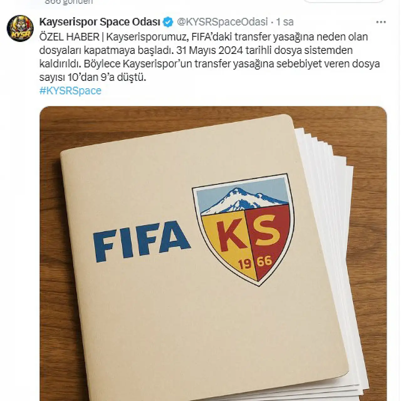 Yapılan paylaşımda, “Özel Haber! Kayserisporumuz, FIFA’daki transfer yasağına neden olan dosyaları kapatmaya başladı. 31 Mayıs 2024 tarihli dosya sistemden kaldırıldı. Böylece Kayserispor’un transfer yasağına sebebiyet veren dosya sayısı 10’dan 9’a düştü” ifadeleri kullanıldı.