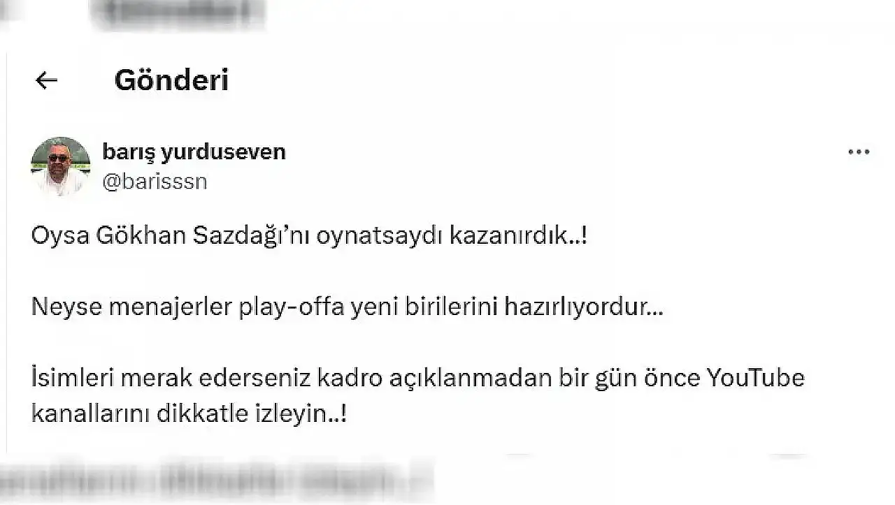 Kayserispor’un A Milli Takım’a davet edilen futbolcusu Gökhan Sazdağı’na atıfta bulunan Barış Yurduseven, “Oysa Gökhan Sazdağı’nı oynatsaydı, kazanırdık..! Neyse, menajerler play-off’a yeni birilerini hazırlıyordur… İsimleri merak ederseniz, kadro açıklanmadan bir gün önce YouTube kanallarını dikkatle izleyin..!” ifadelerini kullanmıştı.