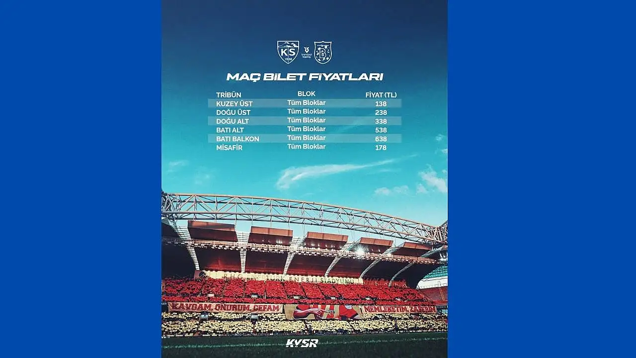 Trendyol Süper Lig 2025-2026 sezonu 19. hafta mücadelesinde Kayserispor, Rams Başakşehir’i konuk edecek. Sarı-kırmızılı ekip, 24 Ocak Cumartesi günü saat 14.30’da RHG Enertürk Enerji Stadyumu’nda oynanacak karşılaşmada taraftarıyla buluşacak. Müsabakanın biletleri satışa sunuldu. Kayserispor’dan açıklanan bilet fiyatları tribünlere göre şu şekilde belirlendi: Kuzey Üst tribün 138 TL, Doğu Üst tribün 238 TL, Doğu Alt tribün 338 TL, Batı Alt tribün 538 TL, Batı Balkon tribün 638 TL ve Misafir tribün 178 TL.