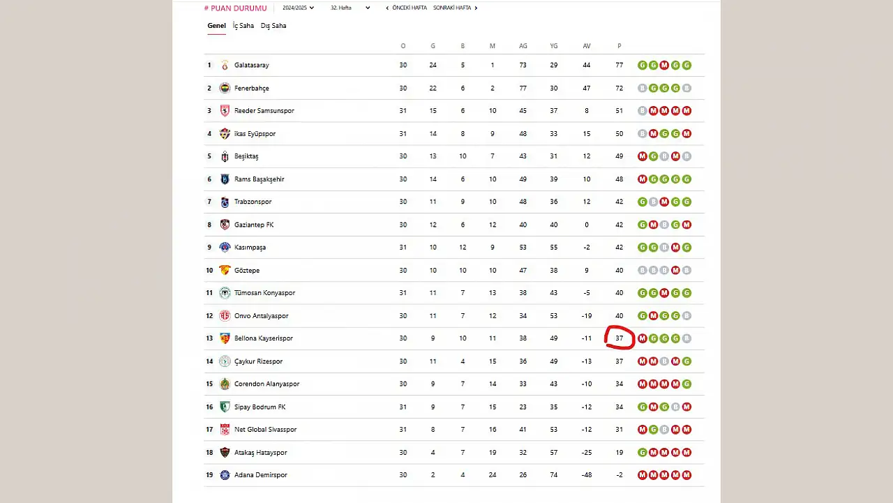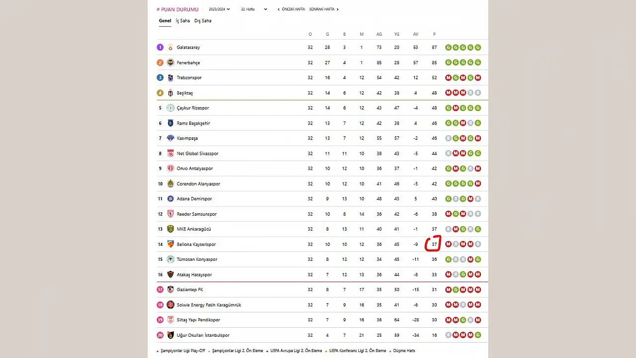 Kayserispor, 32. hafta itibariyle 37 puanla 13. basamakta yer alıyor. Sarı-Kırmızılı takım, geçtiğimiz sezon da 32. hafta yine 13. basamakta yer alırken, 37 puanı bulunuyordu. Kayserispor, geçtiğimiz sezon Recep Uçar ile büyük çıkış yakalamış, ardından da aynı hocayla büyük düşüş yaşamıştı. Sezona Çağdaş Atan ile başlayan, istifasıyla Recep Uçar’ın çalıştırdığı Kayserispor’da, son olarak Burak Yılmaz göreve gelmişti.
