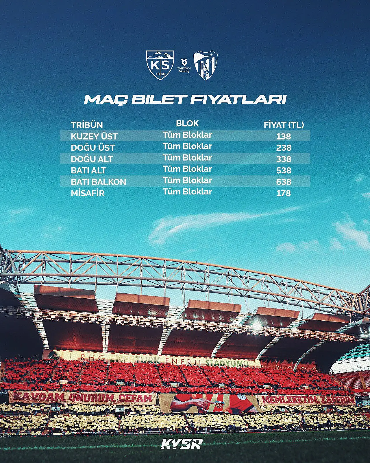 Süper Lig'in 21. haftasında evinde Kocaelispor'u konuk edecek olan Kayserispor'da bu müsabakanın bilet fiyatları açıklandı. 138 TL'den başlayan biletler yarın satışa başlayacak. İşte fiyatlar...