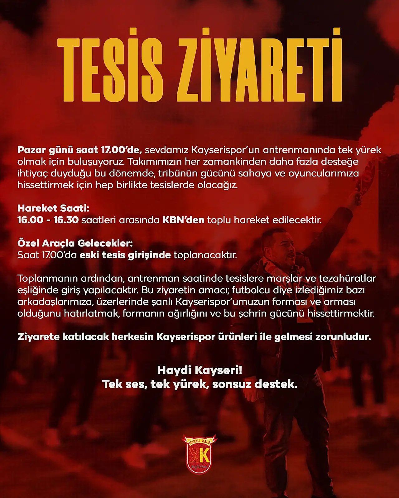 “Tesis ziyareti” başlığıyla yapılan duyuruda, “Pazar günü saat 17.00’de, sevdamız Kayserispor’un antrenmanında tek yürek olmak için buluşuyoruz. Takımımızın her zamankinden daha fazla desteğe ihtiyaç duyduğu bu dönemde, tribünün gücünü sahaya ve oyuncularımıza hissettirmek için hep birlikte tesislerde olacağız. Hareket Saati: 16.00 – 16.30 saatleri arasında KBN’den toplu hareket edilecektir. Özel araçla gelecekler: Saat 17.00’da eski tesis girişinde toplanacaktır” denildi.