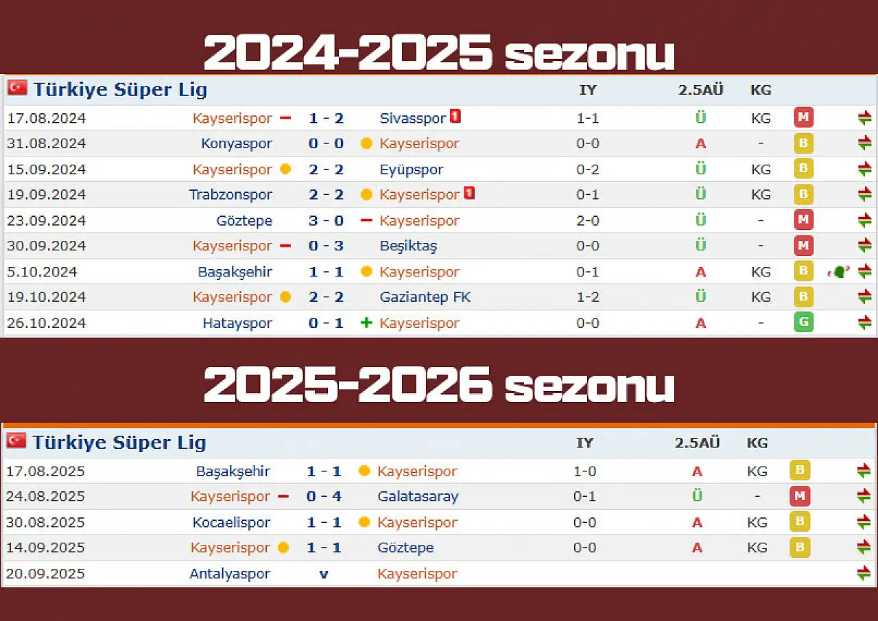 Süper Lig’in ilk haftasında oynayacağı Beşiktaş maçı ertelenen Kayserispor, sonrasında çıktığı 4 maçta 3 beraberlik 1 yenilgi elde etti. Başakşehir ile 1-1 berabere kalan Kayserispor, Galatasaray’a 4-0 kaybederken, son 2 maçında da Kocaelispor ve Göztepe ile yine 1-1 berabere kaldı.