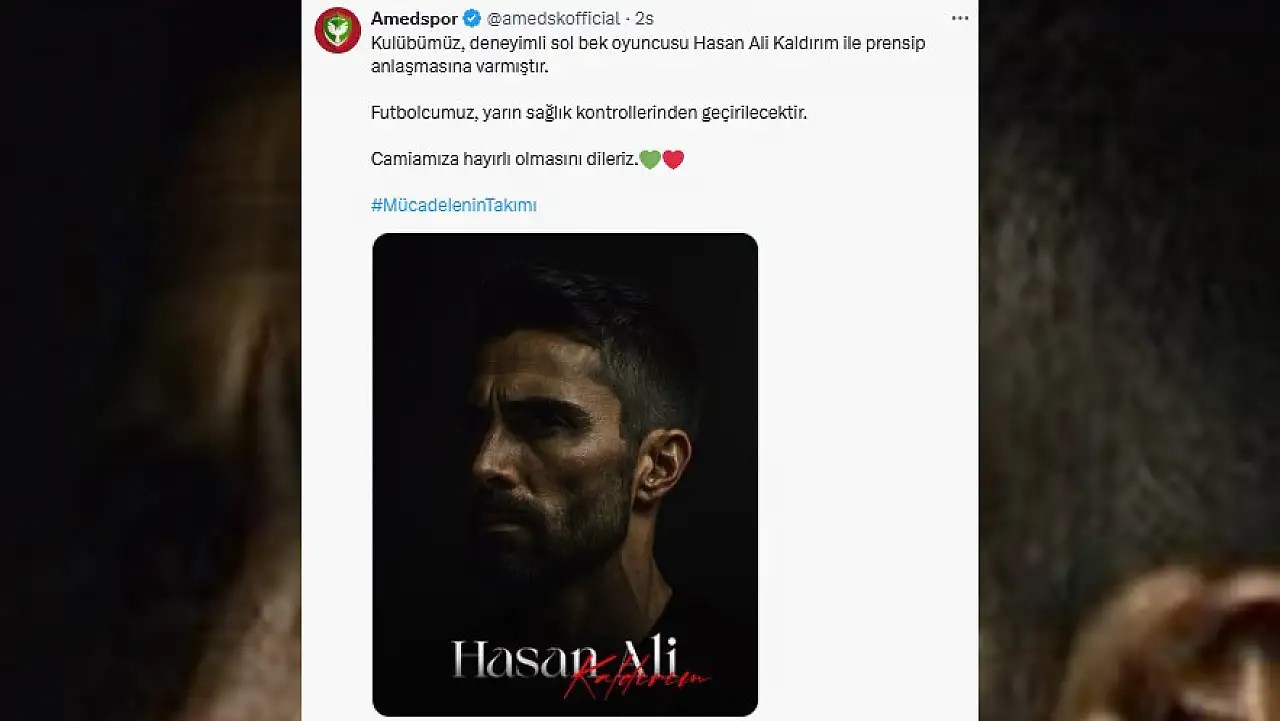 Diyarbakır temsilcisi transferi şu şekilde duyurdu: “Kulübümüz, deneyimli sol bek oyuncusu Hasan Ali Kaldırım ile prensip anlaşmasına varmıştır. Futbolcumuz, yarın sağlık kontrollerinden geçirilecektir. Camiamıza hayırlı olmasını dileriz.”